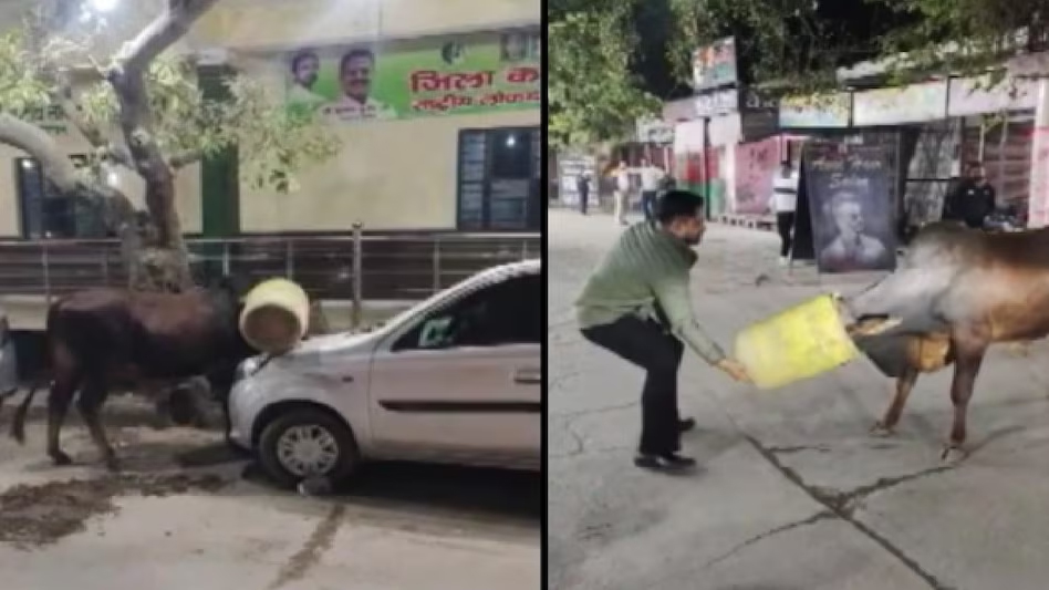शुरू में किसी को समझ नहीं आया कि सड़क पर अचानक भगदड़ क्यों मच गई है। वाहनों ने ब्रेक मार दिए, लोग इधर-उधर भागने लगे और कुछ दुकानदार अपनी दुकानें बंद कर दूर भाग गए। जब लोगों ने पास जाकर देखा तो सब हैरान रह गए—सड़क पर एक सांड तेज रफ्तार से दौड़ रहा था और उसके सिर पर बड़ा ड्रम चढ़ा हुआ था।