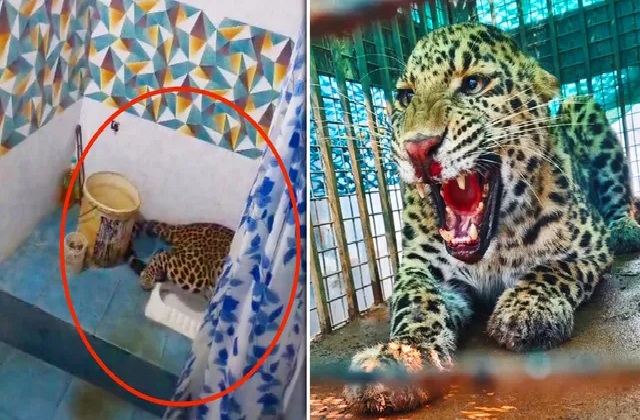 घर के बाथरूम में घुसकर बैठा तेंदुआ! फैली दहशत...देखिए वीडियो