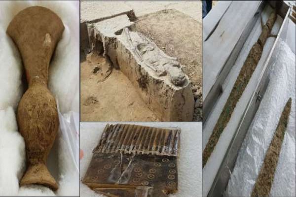 इसके पास ही एक गढ्ढे में 2 रथ, ताबूत के सिरहाने में मुकुट जैसी चीज के अवशेष भी मिले हैं। ताबूत के पास 3 तलवारें, 2 खंजर, 1 ढाल, 1 मशाल और एक प्राचीन हेलमेट भी मिला है। पुरातत्वविदों के अनुसार साल 2005 में इसी जगह से 120 मीटर की दूरी पर एक कब्रगाह मिली थी, जिसमें से लगभग 116 कब्रें मिली हैं। उन कब्रों के पास भी तलवारें आदि मिली थी। अधिकारियों का मानना है कि शायद यह कब्रें योद्धाओं की रही होगी।