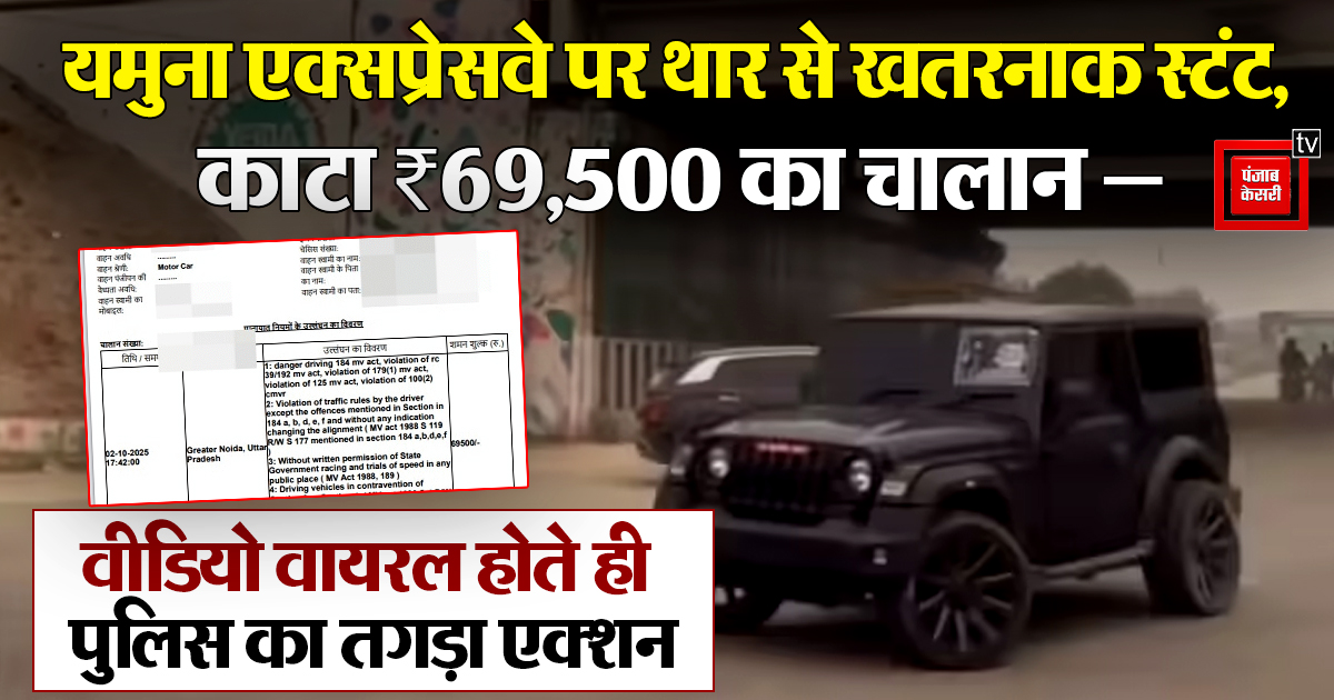 यमुना एक्सप्रेसवे पर थार से खतरनाक स्टंट, काटा ₹69,500 का चालान — वीडियो वायरल होते ही पुलिस का तगड़ा एक्शन
