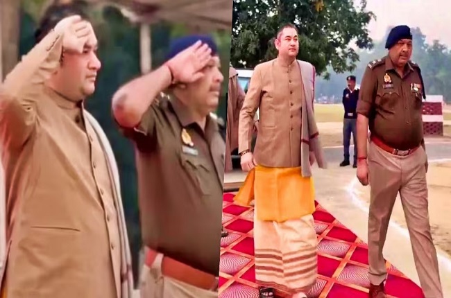 कथावाचक को पुलिस ने ऐतिहासिक सलामी दी , कप्तान RN सिंह ने कथावाचक को एक दो गनर नहीं, पूरी परेड की सलामी दिलाई ,पलक पाँवड़े बिछवा दिए,रील निर्माण भी हुआ ,मामला वायरल है ,विपक्ष सवाल उठा रहा है !! pic.twitter.com/L9rMWg24OY