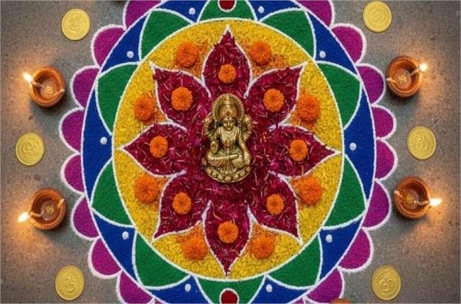 धनतेरस की शाम अगर आप घर को जगमग बनाना चाहते हैं, तो दीयों वाली रंगोली ट्राय करें। रंगों से पैटर्न बनाकर उसके बीच में जलते हुए छोटे दीये रखें। रात में यह डिज़ाइन आपके घर को दिवाली जैसा ग्लो देगा।