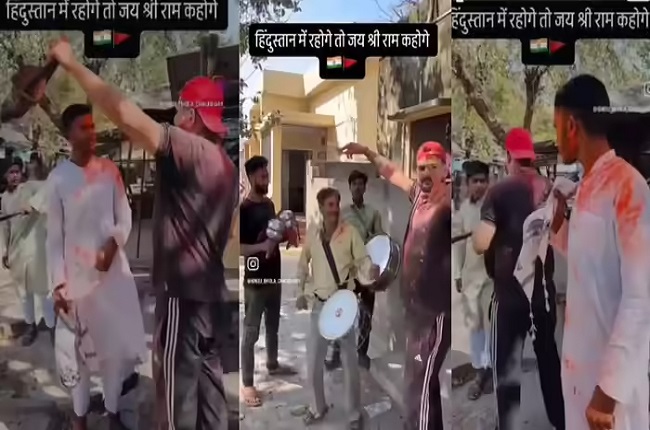 हाथरस : उत्तर प्रदेश के हाथरस जिले में होली पर हिंदू युवक द्वारा मुस्लिम युवकों को जबरन रंग लगाने और जय श्री राम कहलवाने का वीडियो सोशल मीडिया पर वायरल हो रहा है। वीडियो में मुस्लिम युवकों को कथित तौर पर रंग लगाने और जय श्री राम कहने के लिए दवाब बनाया जा रहा है।