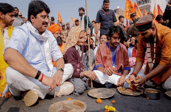 मथुरा में राजा भैया–धीरेंद्र शास्त्री की जोड़ी का जलवा! सड़क पर साथ बैठकर खाई पूड़ी-सब्जी, पदयात्रा में दिखी सनातन एकता की अनोखी झलक!