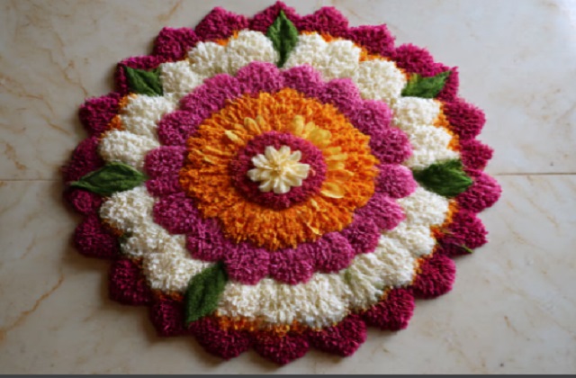 4. | diwali ki rangoli अपनी फूलों वाली रंगोली में आप गेंदा, गुलाब, चमेली या अपनी पसंद के किसी भी फूल का इस्तेमाल कर सकते हैं