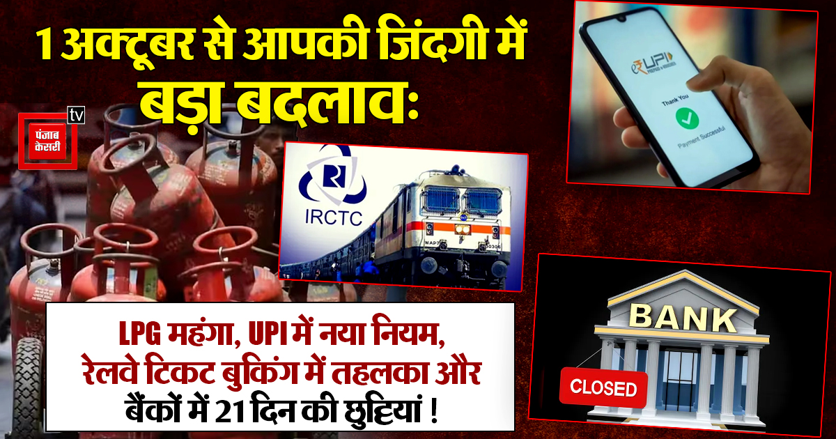 1 अक्टूबर से आपकी जिंदगी में बड़ा बदलाव: LPG महंगा, UPI में नया नियम, रेलवे टिकट बुकिंग में तहलका और बैंकों में 21 दिन की छुट्टियां!