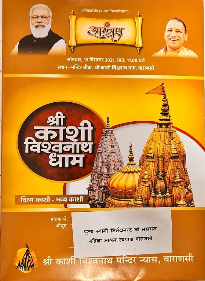 नवीन श्री काशी विश्वनाथ धाम परिसर उन्हीं परिकल्पनाओं का मूर्त रूप है। हमें यह बताते हुए हार्दिक प्रसन्नता की अनुभूति हो रही है कि श्री काशी विश्वनाथ धाम का शुभ लोकार्पण कार्यक्रम माननीय प्रधानमंत्री जी के कर-कमलों से पूज्य संतों व धर्माचार्यों की उपस्थिति में दिनांक 13 दिसम्बर, 2021 (विक्रम संवत् 2078 मार्गशीर्ष शुक्लपक्ष दशमी तिथि) को होने जा रहा है। अतः इस शुभ अवसर पर आपकी गरिमामयी उपस्थिति प्रार्थनीय है, कृपया पधारकर अनुगृहीत करने का कष्ट करे।