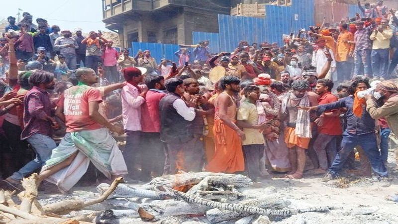 वाराणसी: उत्तर प्रदेश की धार्मिक नगरी वाराणसी में गुरुवार को बाबा मशान नाथ की भव्य पूजा-अर्चना के साथ मणिकर्णिका घाट पर जलती चिताओं के बीच चिता-भस्म होली खेली गई। मान्यता है कि रंगभरी एकादशी के अगले दिन गंगा किनारे बाबा विश्वनाथ जलती चिताओं के मध्य अपने भक्तजनों के साथ चिताभस्म होली खेलने आते हैं। इसी परंपरा का निर्वहन करने के लिए लोगों ने जानलेवा कोरोना महामारी की तनिक भी परवाह नहीं की और हजारों देशी-विदेशी श्रद्धालु मणिकर्णिका घाट पर हर साल होने वाले इस धार्मिक आयोजन में शामिल हुए।